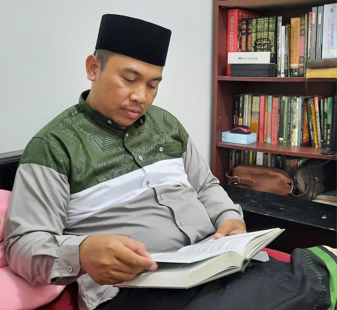 Foto : Dr. Nurdin Sibaweh, Ketua Tim Penulis buku “Cahaya Santri”, tampak khusyuk membaca naskah dalam sesi peluncuran dan diskusi buku pada Haul Akbar KH. Qomaruddin dan Reuni Akbar Alumni Al-Khairiyah Karangtengah, Sabtu (19/7/2025).